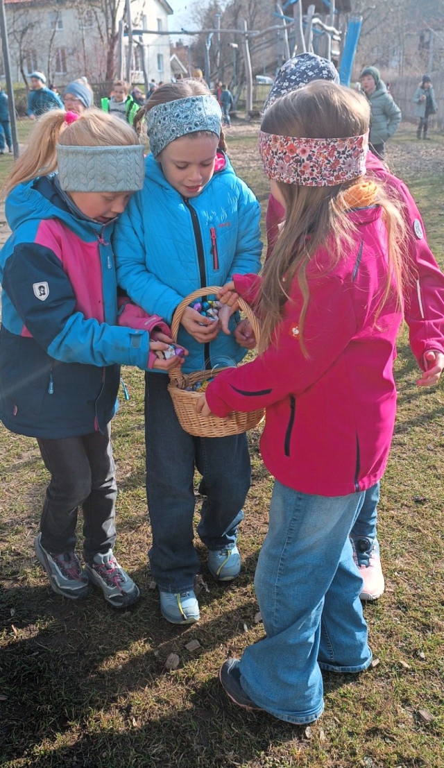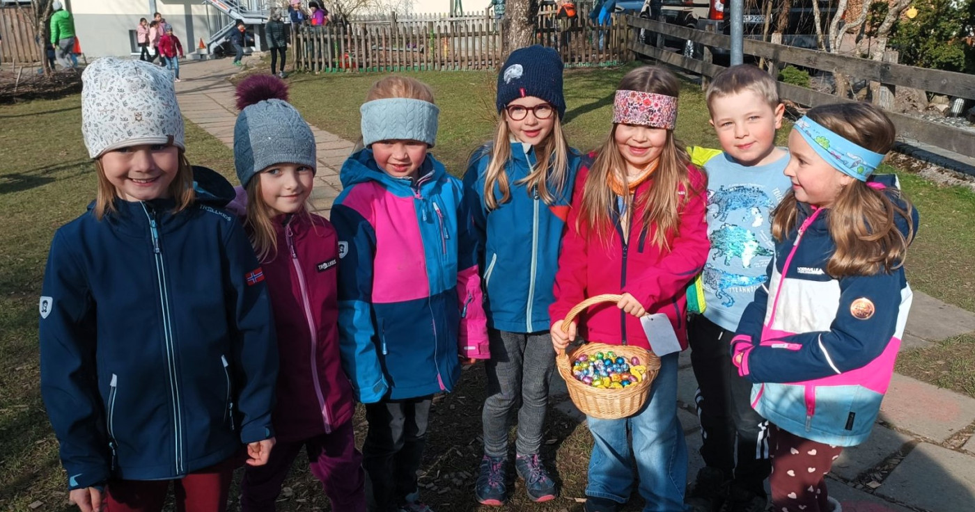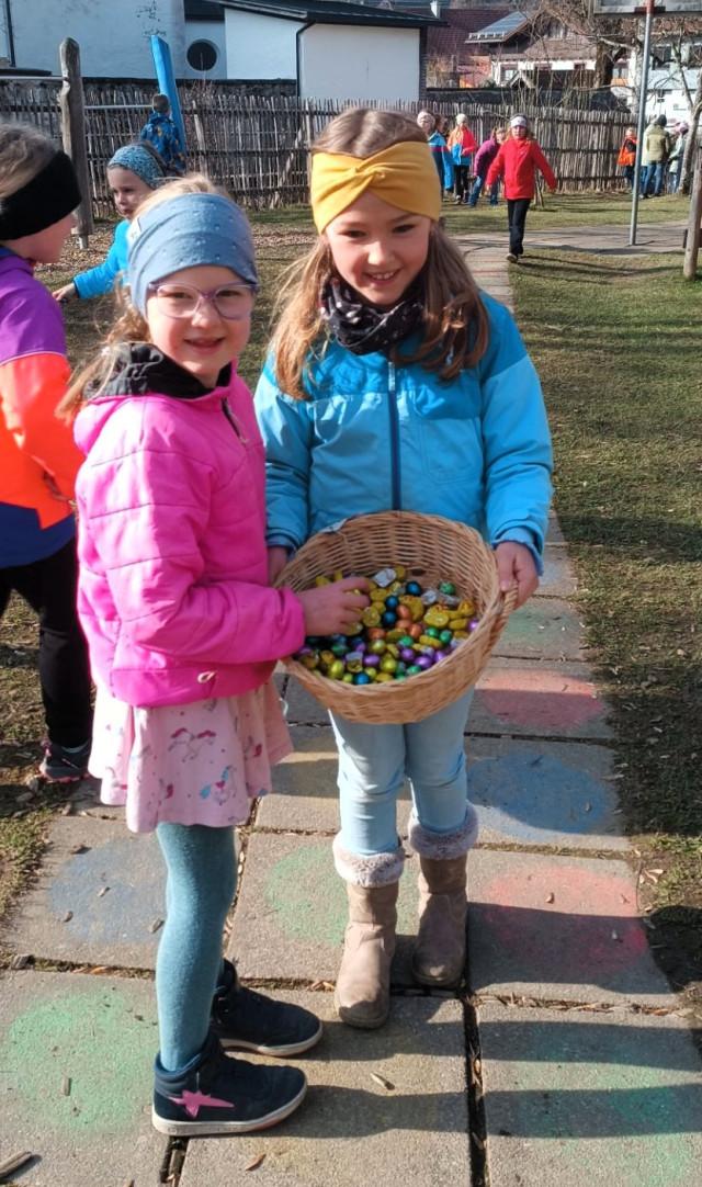 Nun gab es kein Halten mehr: Mit Körben bewaffnet stürmten die SchülerInnen bei schönstem Wetter klassenweise los zur Ostereierjagd. Dank ausgetüftelter Such-Strategien und trainiertem Adlerblick konnten unzählige kleine Eier von Schulgarten, Klettergerüst und Soccerfeld in die Sammelkörbe wandern. Anschließend wurden die süßen Überraschungen gerecht aufgeteilt und durften in selbstgebastelten Osternestchen mit nach Hause genommen werden.